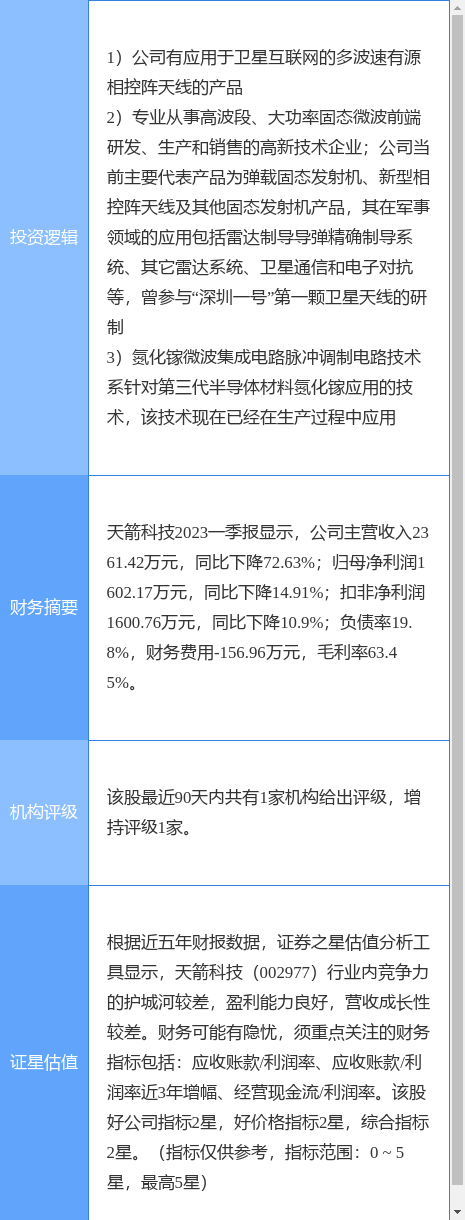 天箭科技涨停收盘,收盘价35.81元。该股于9点32分涨停,1次打开涨停,截止收盘封单资金为3763.43万元,占其流通市值1.61%。
