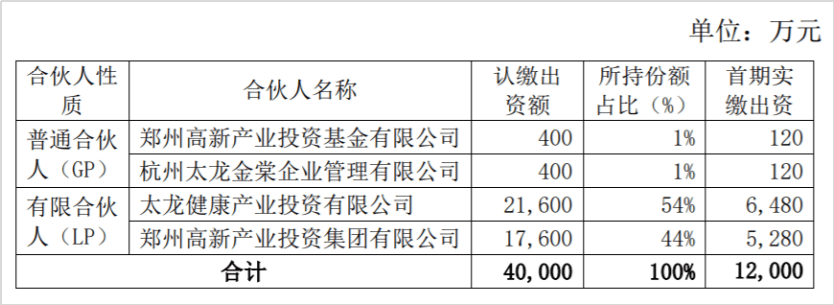 据此前消息,该公司全资全资子公司太龙健康产业投资有限公司作为有限合伙人,太龙健康产业投资有限公司全资子公司杭州太龙金棠企业管理有限公司作为普通合伙人,与公司间接控股股东郑州高新产业投资集团有限公司及其全资子公司郑州高新产业投资基金有限公司共同投资设立郑州龙华医药产业基金合伙企业(有限合伙),其中杭州太龙金棠企业管理有限公司担任执行事务合伙人、郑州高新产业投资基金有限公司担任基金管理人。
