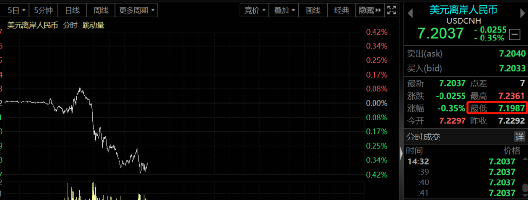 就在刚才不久,人民币迎来非常关键的转折。上周一,券商中国曾分析指出,人民币中短期的底部可能已经出现(详情点击:《大反攻!人民币关键一击,发出两大特别信号!四大利好集体涌现,A股迎来年度最好机会?》 )。今天,这个趋势终于形成了。离岸人民币兑美元一度大涨超300点,并且突破7.2这个重要关口。