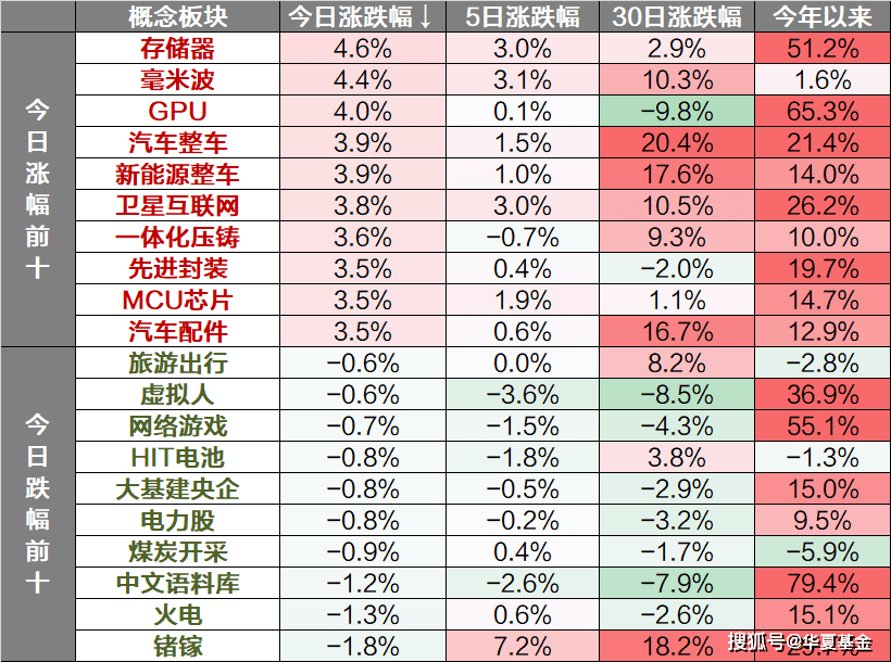 概念主题方面,存储器、毫米波、GPU板块领涨,锗镓、火电、中文语料库板块下跌。