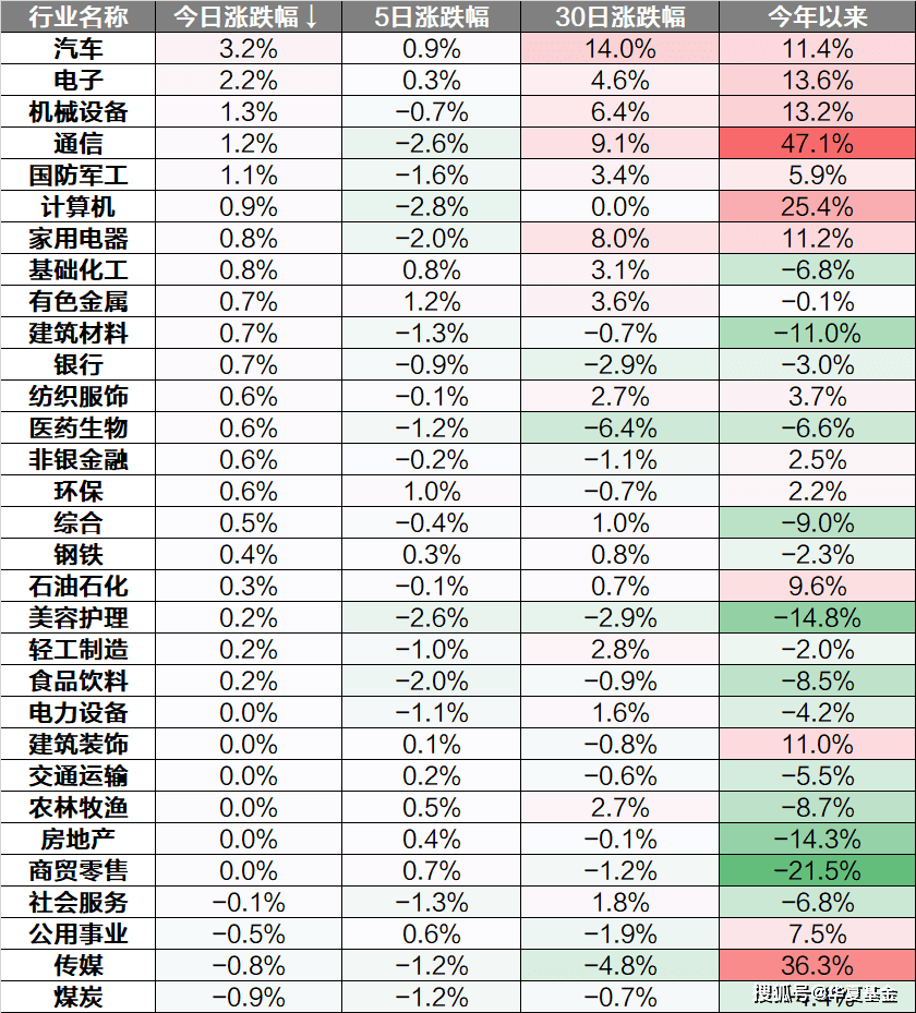 行业上来看,汽车、电子、机械设备领涨,煤炭、传媒、公用事业下跌。