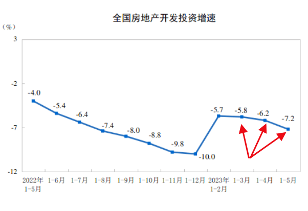 根据国家统计局日前公布的数据,1—5月份,全国房地产开发投资45701亿元,同比下降7.2%,连续3个月下滑(下图):