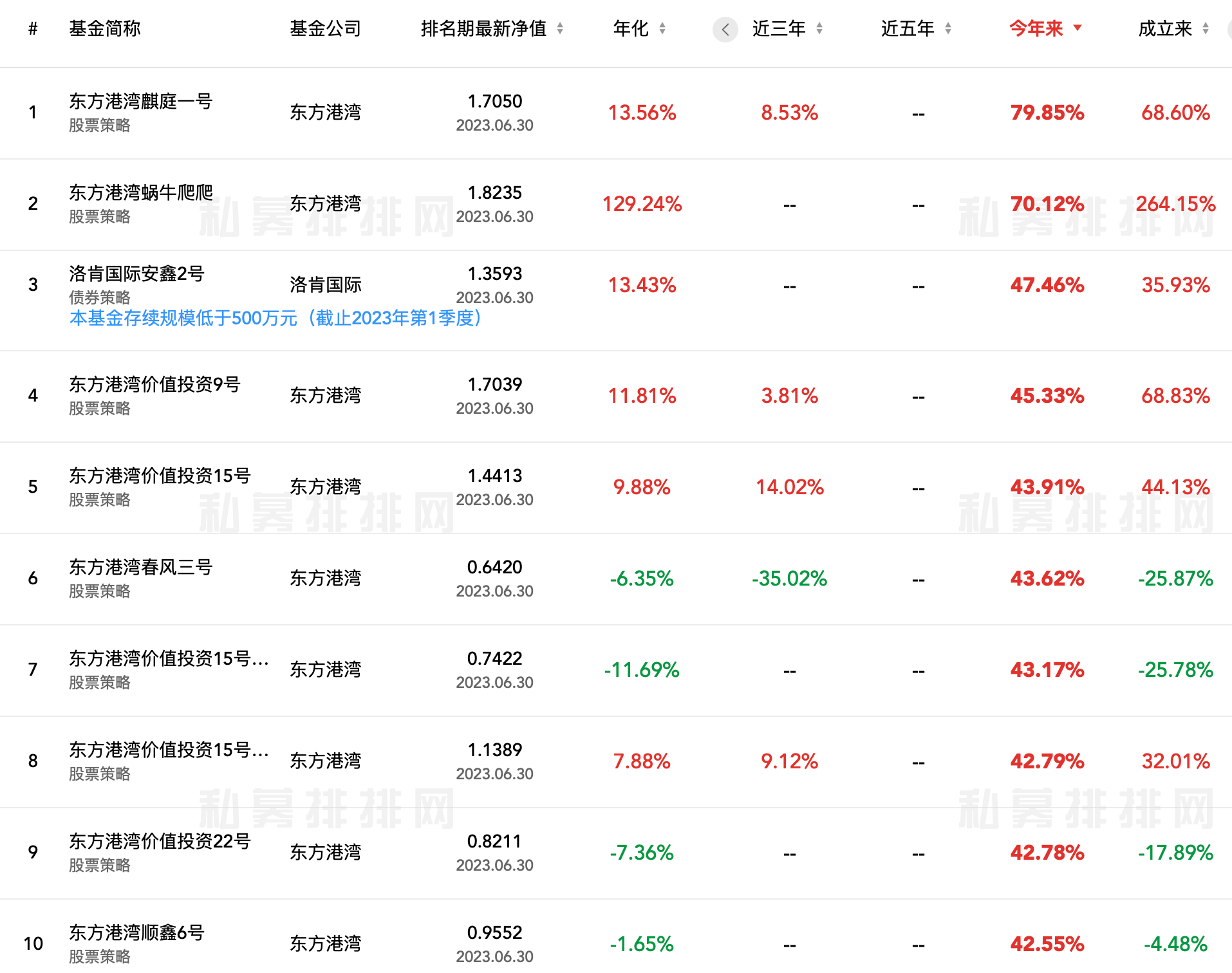 据私募排排网,东方港湾几乎包揽业绩榜前十,其中但斌管理的东方港湾麒庭一号半年收益率高达79.85%,在上半年百亿私募产品收益榜中夺冠,张留信管理的东方港湾蜗牛爬爬收益率也超过70%。