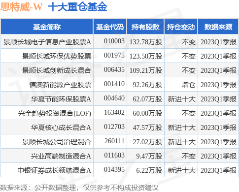 根据2023Q1季报公募基金重仓股数据,重仓该股的公募基金共11家,其中持有数量最多的公募基金为景顺长城电子信息产业股票A。景顺长城电子信息产业股票A目前规模为29.39亿元,最新净值1.1676(7月10日),较上一交易日下跌0.46%,近一年上涨5.47%。该公募基金现任基金经理为杨锐文 张雪薇。杨锐文在任的基金产品包括:景顺长城优选混合,管理时间为2014年10月25日至今,期间收益率为238.89%;景顺长城环保优势股票,管理时间为2016年3月15日至今,期间收益率为210.6%;景顺长城创新成长混合,管理时间为2019年10月17日至今,期间收益率为57.75%;景顺长城成长领航混合,管理时间为2020年5月28日至今,期间收益率为25.35%。张雪薇在任的基金产品包括:景顺长城研究精选股票,管理时间为2023年5月13日至今,期间收益率为9.93%。
