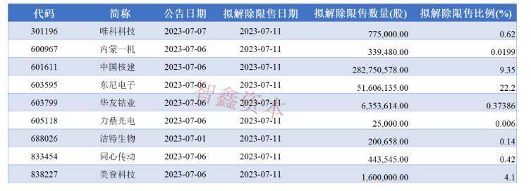 2023年7月11日上市公司解禁名单有9家。