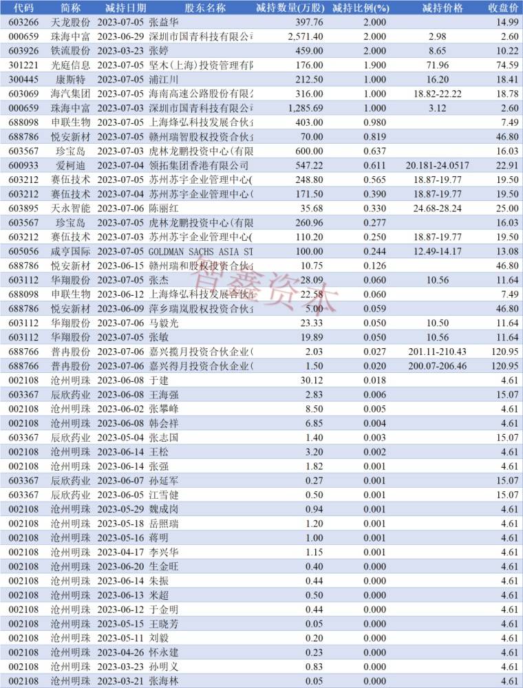 截至2023年7月10日17点,涉及股东减持的前五名上市公司分别为:珠海中富3857.09万股、珍宝岛860.96万股、爱柯迪547.22万股、赛伍技术530.5万股、铁流股份459万股。