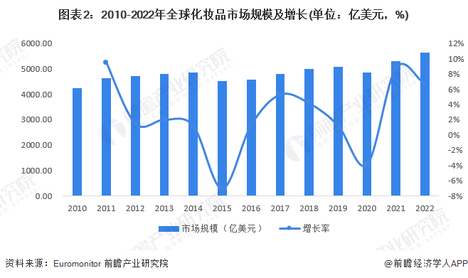 2022年全球化妆品市场规模突破5600亿美元。2010-2015年,全球经济放缓导致化妆品市场规模增速明显走低,2015年甚至出现负增长的情况,原因是欧元区需求不振及南美经济出现严重下滑。2016年以后,全球化妆品市场迎来触底反弹,扭转了此前的发展颓势。2020年,受到疫情影响,全球化妆品市场规模收缩,市场增长下降3.92%,但总体市场规模仍然保持在4800亿美元以上,超过2017年同期市场规模。2021-2022年,全球化妆品市场规模快速回升,2022年全球化妆品市场规模达到近十年最大值,为5652.0亿美元。