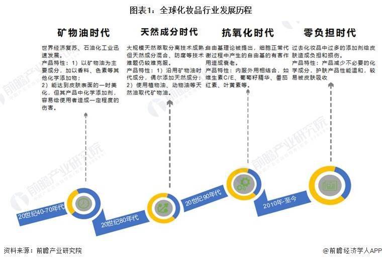 全球化妆品行业发展分为四个阶段。全球化妆品的发展,主要受技术与消费者护肤理念的演进推动下持续发展,先后经历石油化工工业、大规模天然萃取分离技术、自由基理论、皮肤负担理念的更迭,可以分为矿物油、天然成分、抗氧化、零负担四个时代。