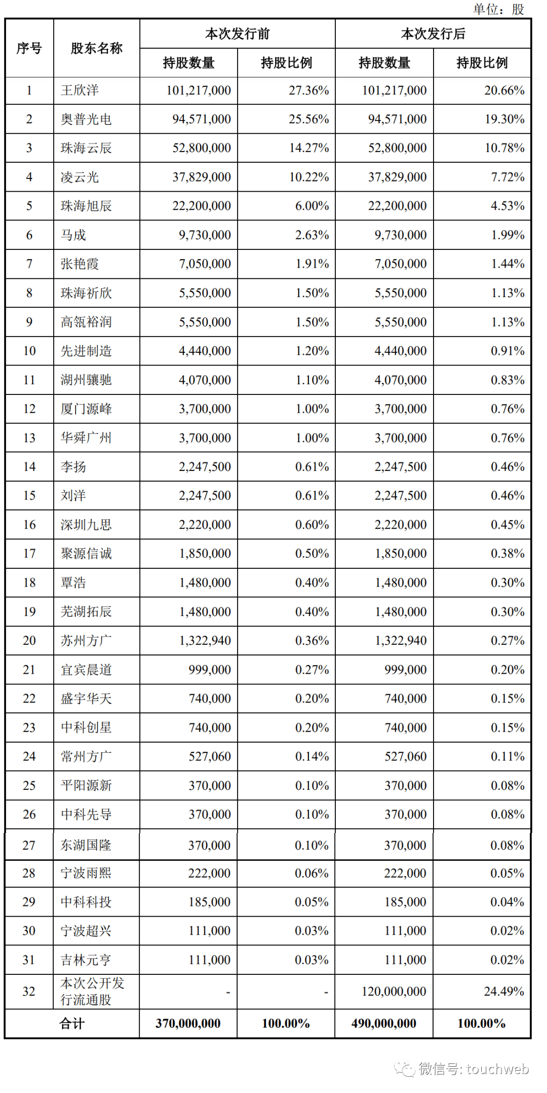 IPO后,王欣洋持股为20.66%,奥普光电持股为19.3%,珠海云辰持股为10.78%,凌云光持股为7.72%,珠海旭辰持股为4.53%,马成持股为1.99%,张艳霞持股为1.44%,珠海祈欣、高瓴裕润分别持股为1.13%,先进制造持股为0.91%,湖州骧驰持股为0.83%,厦门源峰、华舜广州分别持股为0.76%;