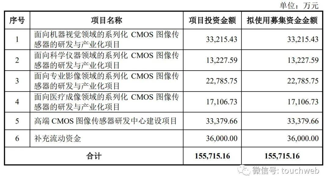 其中,3.32亿元用于面向机器视觉领域的系列化CMOS图像传感器的研发与产业化项目,1.32亿元用于面向科学仪器领域的系列化CMOS图像传感器的研发与产业化项目,2.28亿元用于面向专业影像领域的系列化CMOS图像传感器的研发与产业化项目,1.71亿元用于面向医疗成像领域的系列化CMOS图像传感器的研发与产业化项目,3.34亿元用于高端CMOS图像传感器研发中心建设项目,3.6亿元用于补充流动资金。
