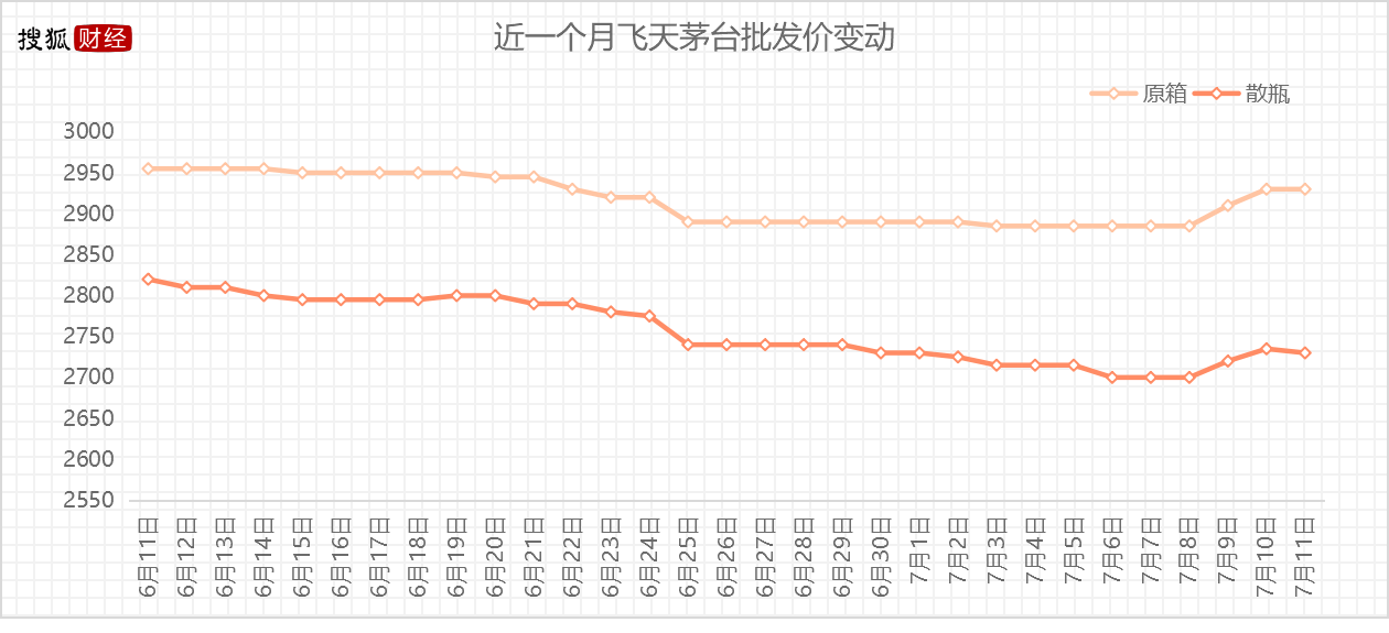 茅台经销商张洋向搜狐财经表示,飞天茅台市场批发价于近期有所攀升,涨价幅度近100元/瓶,原因系本月货量较少,且7月的货物到目前为止仍未收到。当日原箱价格涨至2980元/瓶,散瓶涨至2750元/瓶,团购价格2900元/瓶。