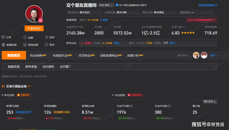 从销量上来看,交个朋友虽然依旧维持着头部主播的业绩,近30日直播销售额1亿-2.5亿,单场直播销售额破千万,却也时常掉落至抖音带货榜(小时)前五十名开外。