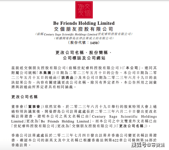 7月6日,世纪睿科发布公告,宣布中英文名正式改为“交个朋友控股”及“BE FRIENDS HLDG”,自7月11日起生效。