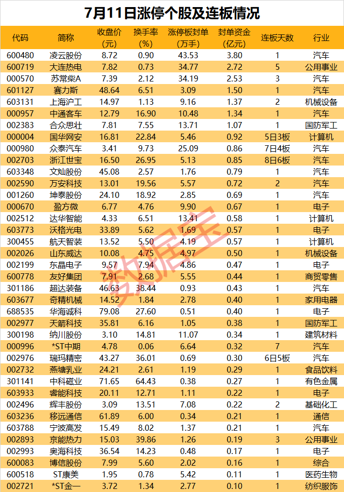涨停个股:凌云股份、苏常柴A、赛力斯、中通客车、众泰汽车、浙江世宝、山东威达、宁波高发、万安科技、瑞玛精密、移远通信、文灿股份、坤泰股份、超达装备、纳川股份