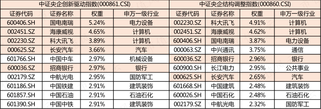 两大指数前十大权重股集中度都不高,占比分别35%和32%,另外在国电南瑞、海康威视、科大讯飞、长安汽车和招商银行五只是重合的。不同的是,央企创新选择的是中国铁建和中国石油,而央企结构则配置的是中国建筑和中国石化。
