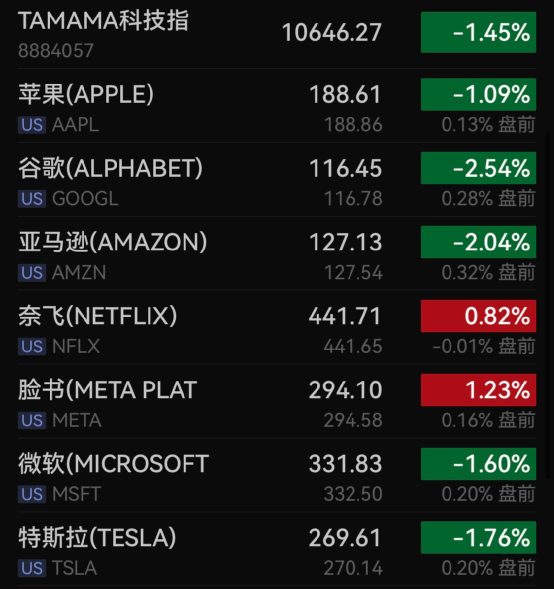 受到此消息的影响,美东时间周一(7月10日),几大科技巨头股价均有所下跌,谷歌母公司alphabet和亚马逊均跌超2%,微软、苹果、特斯拉跌幅也超1%。