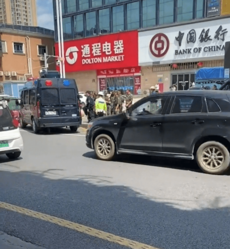 目击者拍摄的现场视频显示,在长沙汽车西站,枫林三路与玉兰路交口附近,中国银行(望城坡支行)与隔壁中国工商银行(长沙汽车西站支行)门前有武警和特警车辆停靠。