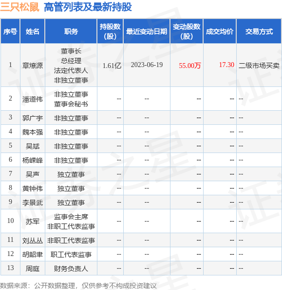 三只松鼠的高管列表及最新持股情况如下:
