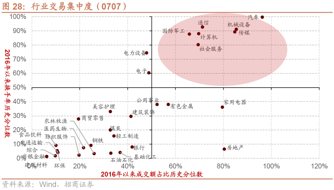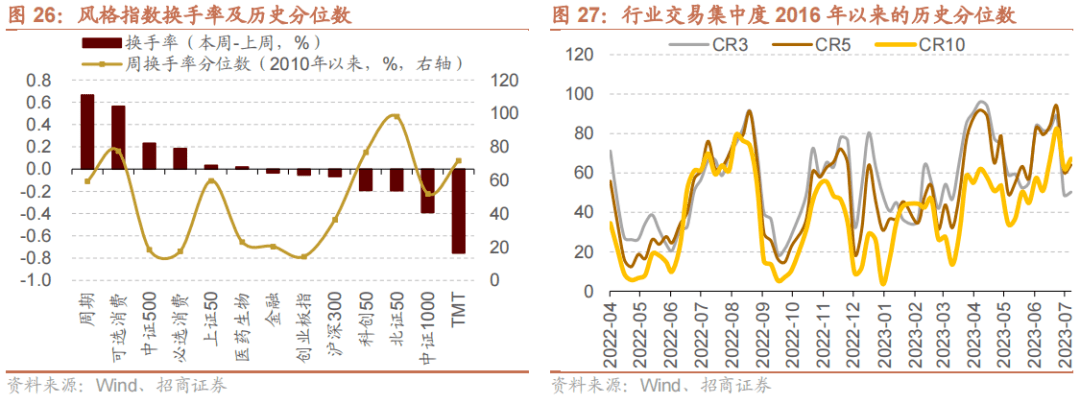 上周(7/3-7/7)关注度相对提升的风格指数及大类行业为周期、可选消费、中证500。当周换手率历史分位数排名前5的行业为:北证50(98.2%)、可选消费(77.5%)、科创50(76.8%)、TMT(71.8%)、上证50(59.8%)。