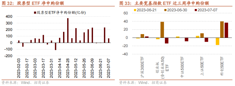 上周(7/3-7/7)ETF净申购,当周净申购67.1亿份,宽指ETF申赎参半,其中沪深300ETF申购较多,创业板(含创业板50)ETF赎回较多;行业ETF以净申购为主,其中医药ETF申购较多,军工ETF赎回较多。具体的,沪深300ETF净申购3.2亿份;创业板ETF净赎回13.9亿份;中证500ETF净赎回8.6亿份;上证50ETF净赎回10.0亿份。双创50ETF净申购0.5亿份。行业ETF方面,信息技术行业净申购24.5亿份;消费行业净申购11.7亿份;医药行业净申购43.4亿份;券商行业净赎回4.1亿份;金融地产行业净申购8.1亿份;军工行业净赎回11.8亿份;原材料行业净申购0.3亿份;新能源&智能汽车行业净申购7.4亿份。