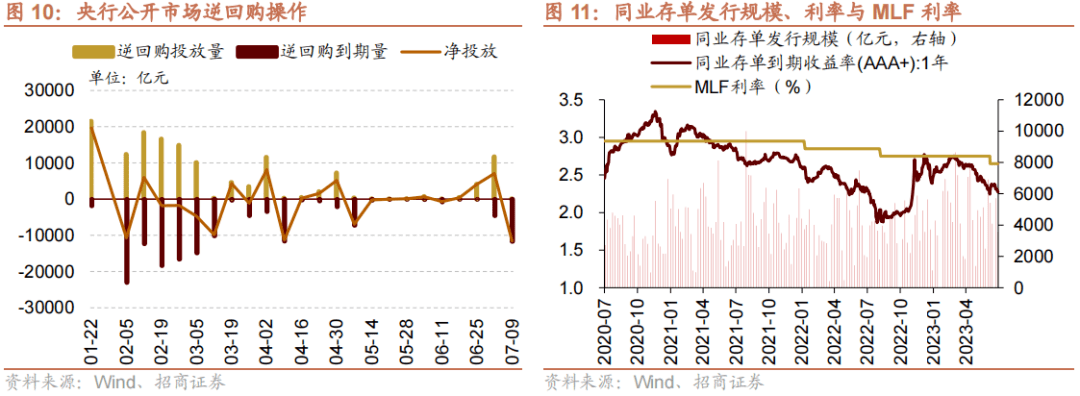 同业存单发行规模下降,发行利率涨跌不一。上周(7/3-7/7)同业存单发行423只,较上期减少113只;发行总规模3544.1亿元,较上期减少2175.0亿元;截至7月7日,1个月、3个月和6个月发行利率分别较前期变化-8.3bp、12.8bp、-17.9bp至2.05%、2.18%、2.29%。