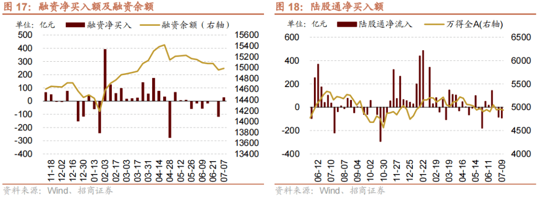 资金供给方面,上周(7/3-7/7)新成立偏股类公募基金23.4亿份,较前期减少29.9亿份。股票型ETF较前期净流出,对应净流出7.8亿元。 上周整个市场融资净买入28.4亿元,从前期净流出转为净流入,截至7月7日,A股融资余额为14983.3亿元。陆股通上周净流出,当周净流出规模为91.6亿元,净卖出额较前期扩大6.8亿元。