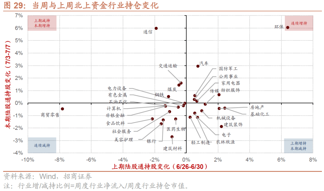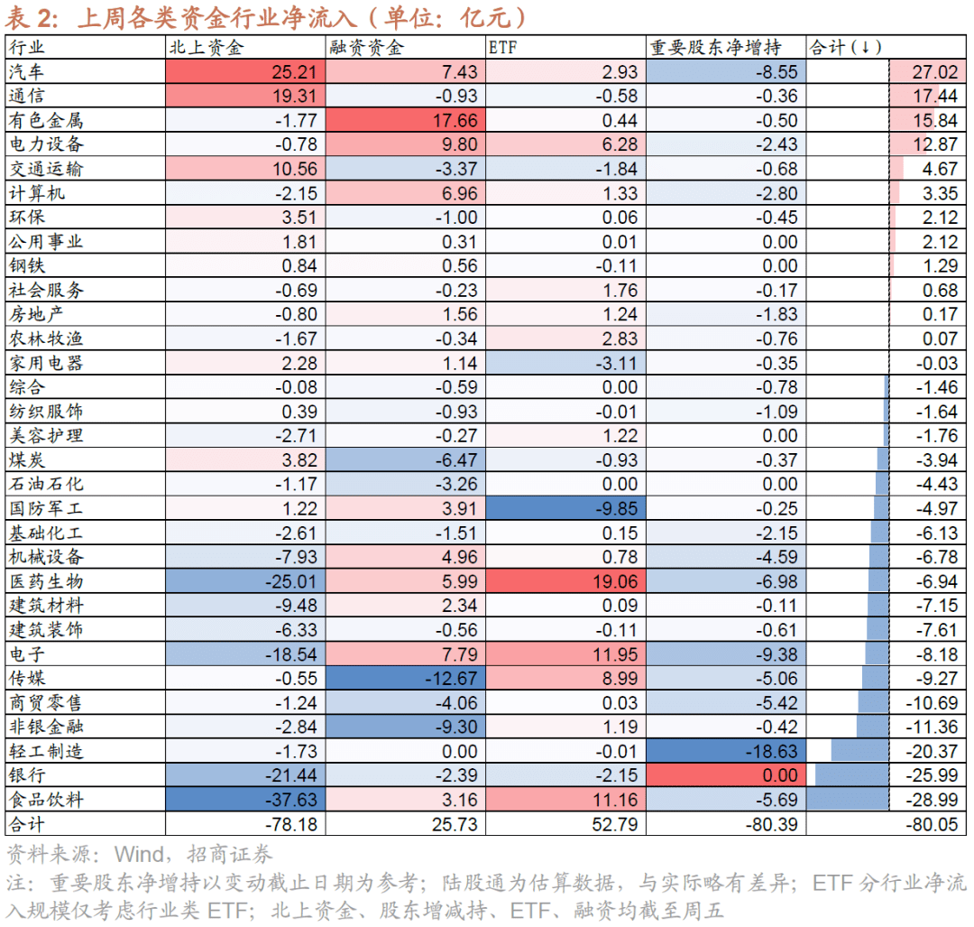 行业偏好上,上周(7/3-7/7)汽车、通信、有色金属获各类资金净流入规模较高。上周陆股通净流出91.6亿元,净买入规模较高的行业为汽车、通信、交通运输,买入金额分别为25.2亿元、19.3亿元、10.6亿元。净卖出规模较高的行业是食品饮料、医药生物、银行等行业。融资资金净流入28.4亿元,净买入规模较高的行业为有色金属(+17.7亿元)、电力设备(+9.8亿元)、电子(+7.8亿元)等行业,净卖出传媒(-12.7亿元)、非银金融(-9.3亿元)、煤炭(-6.5亿元)等行业。