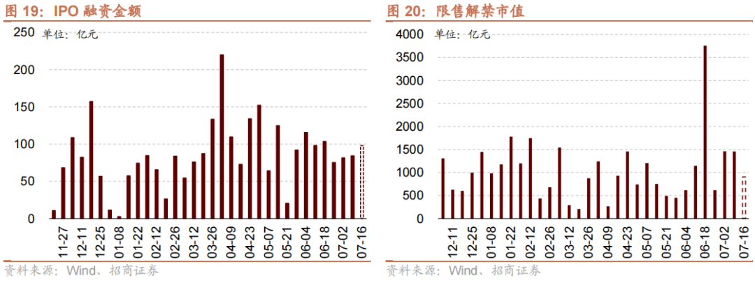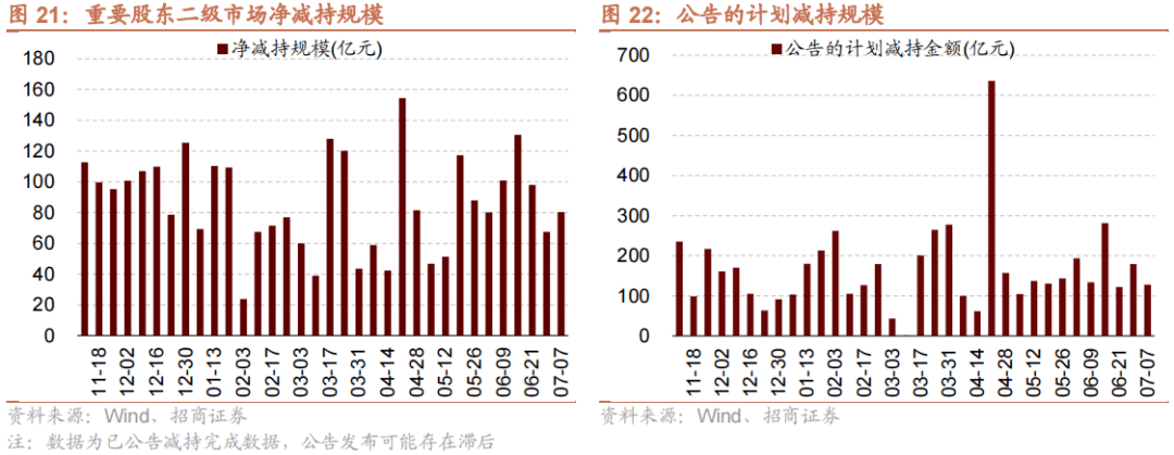 资金需求方面,上周(7/3-7/7)IPO融资金额回升至84.3亿元,共有9家公司进行IPO发行,截至7月7日公告,未来一周将有10家公司进行IPO发行,计划募资规模98.0亿元。重要股东净减持规模扩大,净减持80.4亿元;公告的计划减持规模128.1亿元,较前期下降。