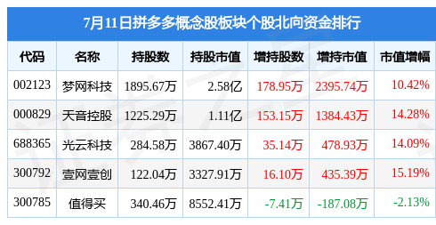 北向资金方面,当日拼多多概念股板块北向资金持股市值为5.27亿元,增持0.45亿元。其中增持最多的是梦网科技,增持了0.24亿元。减持持最多的是值得买,减持了187.08万元。拼多多概念股板块北向资金持股变动明细见下表:
