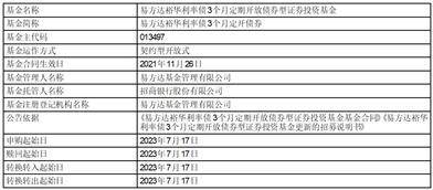 注:(1)易方达裕华利率债3个月定期开放债券型证券投资基金(以下简称“本基金”)为定期开放基金,第八个运作期为2023年7月16日至2023年10月15日(含该日)。其中2023年7月16日至2023年7月21日为开放运作期,本基金开放申购、赎回与转换业务,但具体办理时间为上海证券交易所、深圳证券交易所的正常交易日的交易时间;2023年7月22日至2023年10月15日(含该日)为封闭运作期,本基金不开放申购、赎回与转换业务。本基金定期定额投资业务具体开放时间将另行公告。