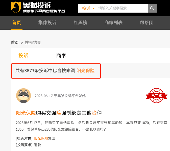 在“黑猫投诉”网站,输入“阳光保险”发现3873条投诉结果,竟然比保费收入体量是其7倍的平安保险(3663条结果)还要多,只略低于中国人寿的4153条。