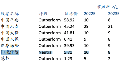 市场“用脚投票”的结果显示,截至7月初,阳光保险市盈率为9.11倍,低于同板块的友邦保险(01299.HK)和保诚(02378.HK),也不及中国太平(00966.HK)和中国人寿(02628.HK),处于行业中间偏下水平。在海通国际的一份研报中,给阳光保险“中性Neutral”评级,2023年市盈率展望为8倍。