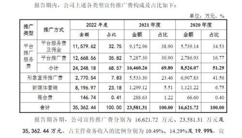以2022年为例,敷尔佳将平台宣传推广费分为平台推广服务费、形象宣传推广费、新媒体营销和展会费,分别占宣传推广费的68.57%、7.83%、23.18%、0.41%。