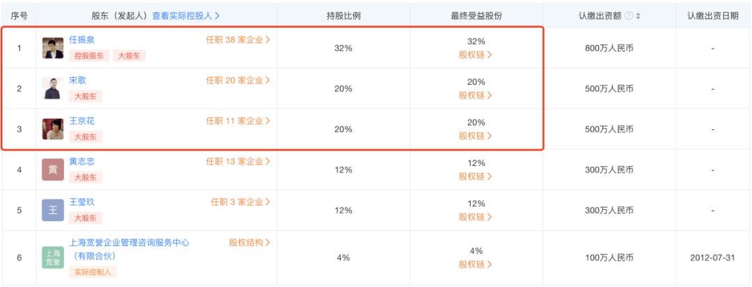 天眼查显示,九州建元成立于2008年,经营范围含投资管理、投资咨询、资产管理等,企业注册资本2500万人民币,实缴资本2400万人民币。九州建元第一大股东为任振泉(即任泉),持股比例为32%。