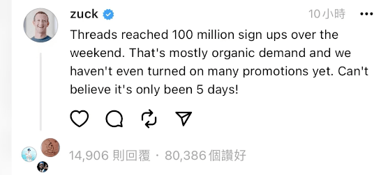 当地时间7月10日,Facebook母公司Meta CEO扎克伯格宣布,周末期间Threads注册人数达到1亿,自平台推出以来仅过了5天,超越了ChatGPT的用户增速。