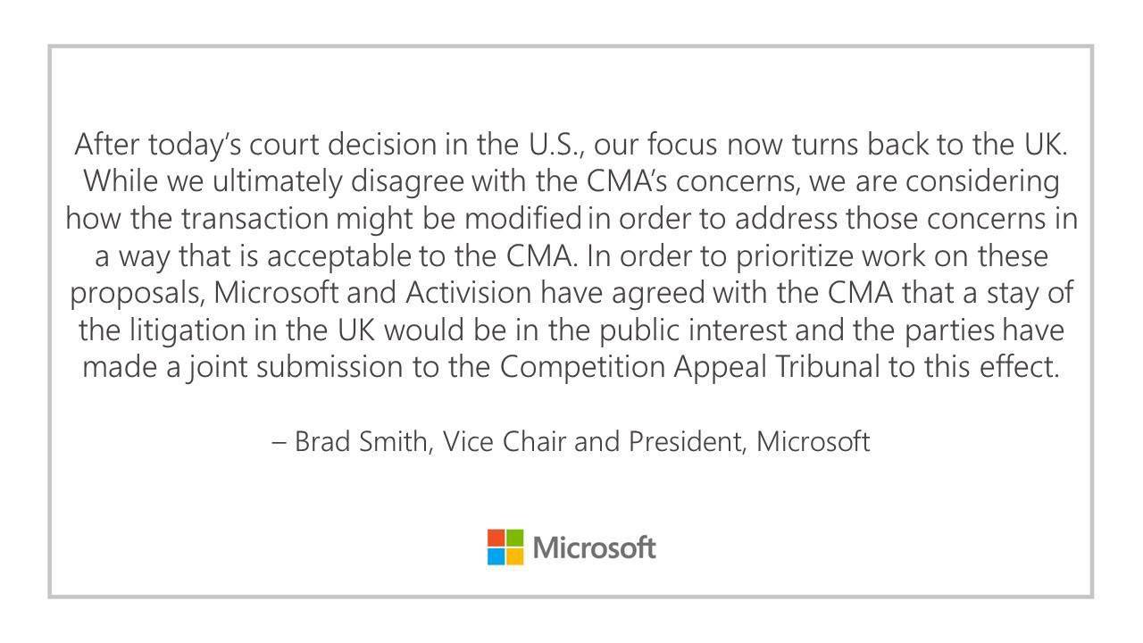 根据微软总裁布拉德・史密斯的声明,CMA 现已经同意与微软就“收购动视暴雪”进行谈判。微软表示:将尽力消除监管机构的担忧以打消英国市场监督局的顾虑,从而完成对动视暴雪的收购。