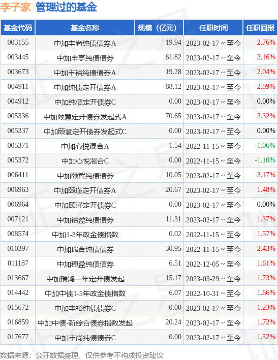 李子家先生:中国国籍,中国人民大学本科,金融学硕士。2016年5月至2020年8月历任中信建投基金交易部交易员、投资部-固收投资部基金经理助理;2020年9月至2022年8月任华夏理财固定收益投资部投资经理。2022年8月加入中加基金管理有限公司,任中加中债-1-5年政策性金融债指数证券投资基金基金经理。2022年11月15日担任中加心悦灵活配置混合型证券投资基金、中加中债-1-3年政策性金融债指数证券投资基金、中加瑞合纯债债券型证券投资基金基金经理。2022年12月5日任中加穗盈纯债债券型证券投资基金的基金经理。2023年3月29日担任中加瑞鸿一年定期开放债券型发起式证券投资基金基金经理。
