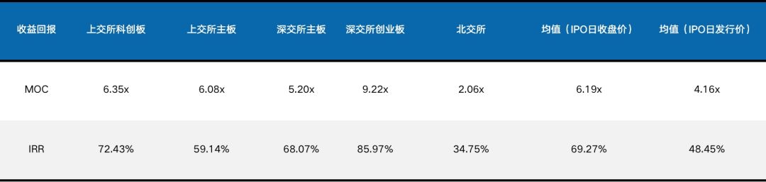 在2023年上半年A股全市场收益回报中,MOC均值(IPO日发行价)为4.16x,MOC均值(IPO日收盘价)为6.19x,单日涨幅48%;IRR均值(IPO日发行价)为48.45%,IRR均值(IPO日收盘价)为69.27%,单日涨幅43%。其中深交所创业板MOC和IRR最高,MOC达到了9.22x,是IPO收盘价收益回报均值的1.5倍,IRR为85.97%,是IPO收盘价收益回报均值的1.2倍。