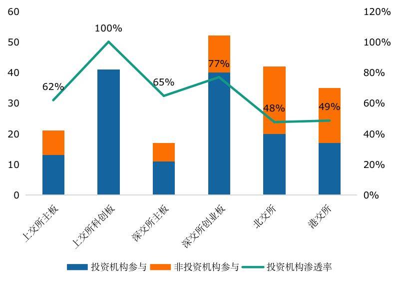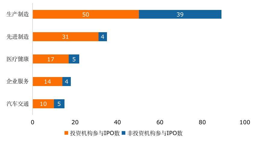 从行业板块细分视角来看投资机构的参与情况,可以清晰的看出在生产制造领域投资机构参与的IPO数和非投资机构参与的IPO数量大致相当,机构参与的IPO数量相对较多。在上市公司IPO行业分布TOP5中除生产制造外,其余行业的上市公司的机构渗透率均在60%以上,以先进制造为最,机构渗透率达88.57%
