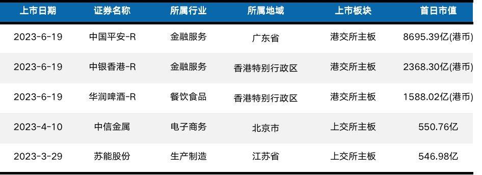 2023年上半年,国内共有229家公司在境内外上市,其中,首日市值前五的公司分别是:中国平安-R、中银香港-R、华润啤酒-R、中信金属、苏能股份。