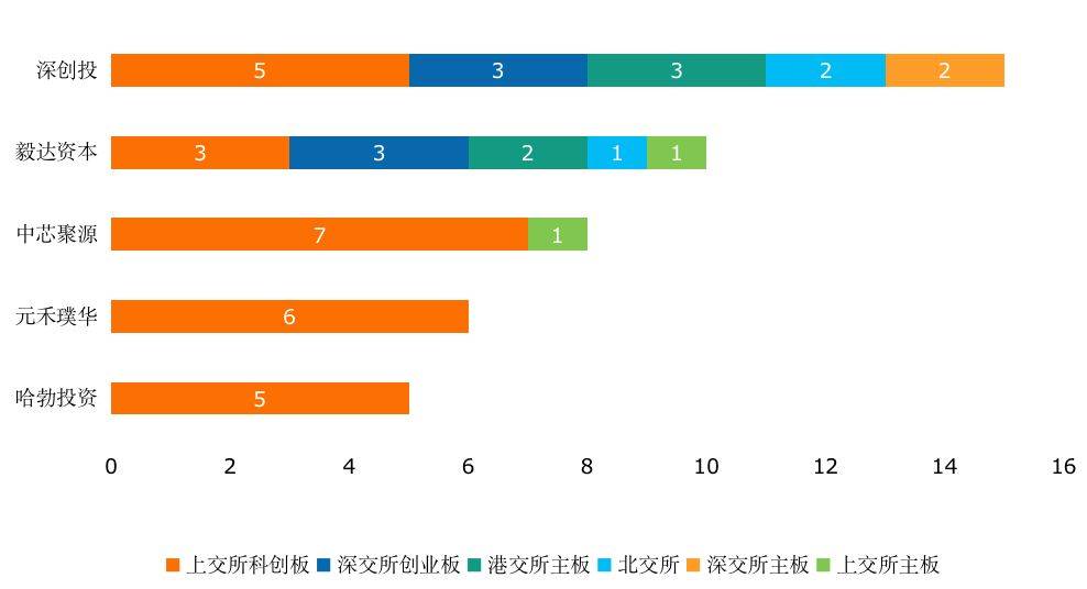 2023年上半年,IPO数量229家,投资机构1210家。在上半年的全部IPO项目里,投资机构参与IPO数TOP5中深创投参与数15家,位列半年度榜单TOP1,其次是毅达资本参与数10家、中芯聚源参与数8家、元禾璞华参与数6家,最后是哈勃投资参与数5家。从H1投资机构IPO数榜单分布可以看出,上市企业IPO主要分布在沪深两市的科创板,但以上交所科创板为主,占IPO总数的59%。
