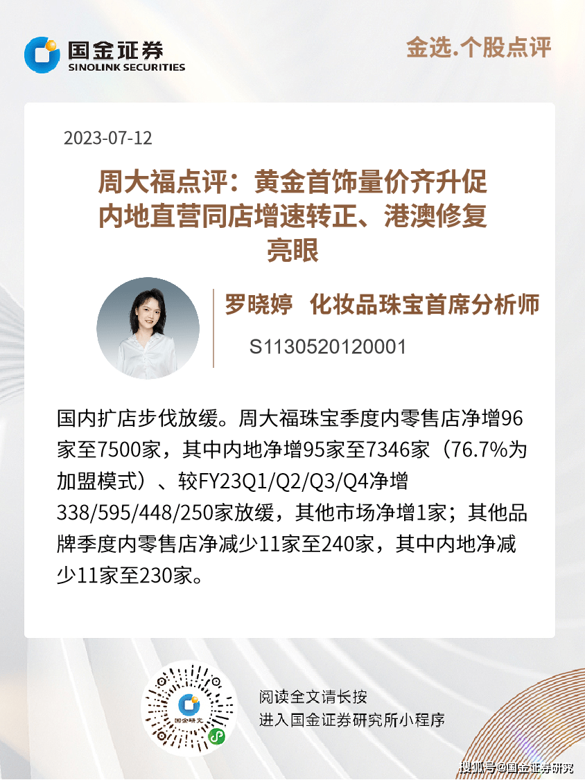 黄金首饰量价齐升促内地直营同店环比转正、港澳延续亮眼表现: