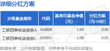 7月12日发布《工银瑞信四季收益债券型证券投资基金(LOF)2023年第二次分红公告》。本次分红为本基金第三十九次分红,2023年第二次分红。公告显示,本次分红的收益分配基准日为6月6日,详细分红方案如下: