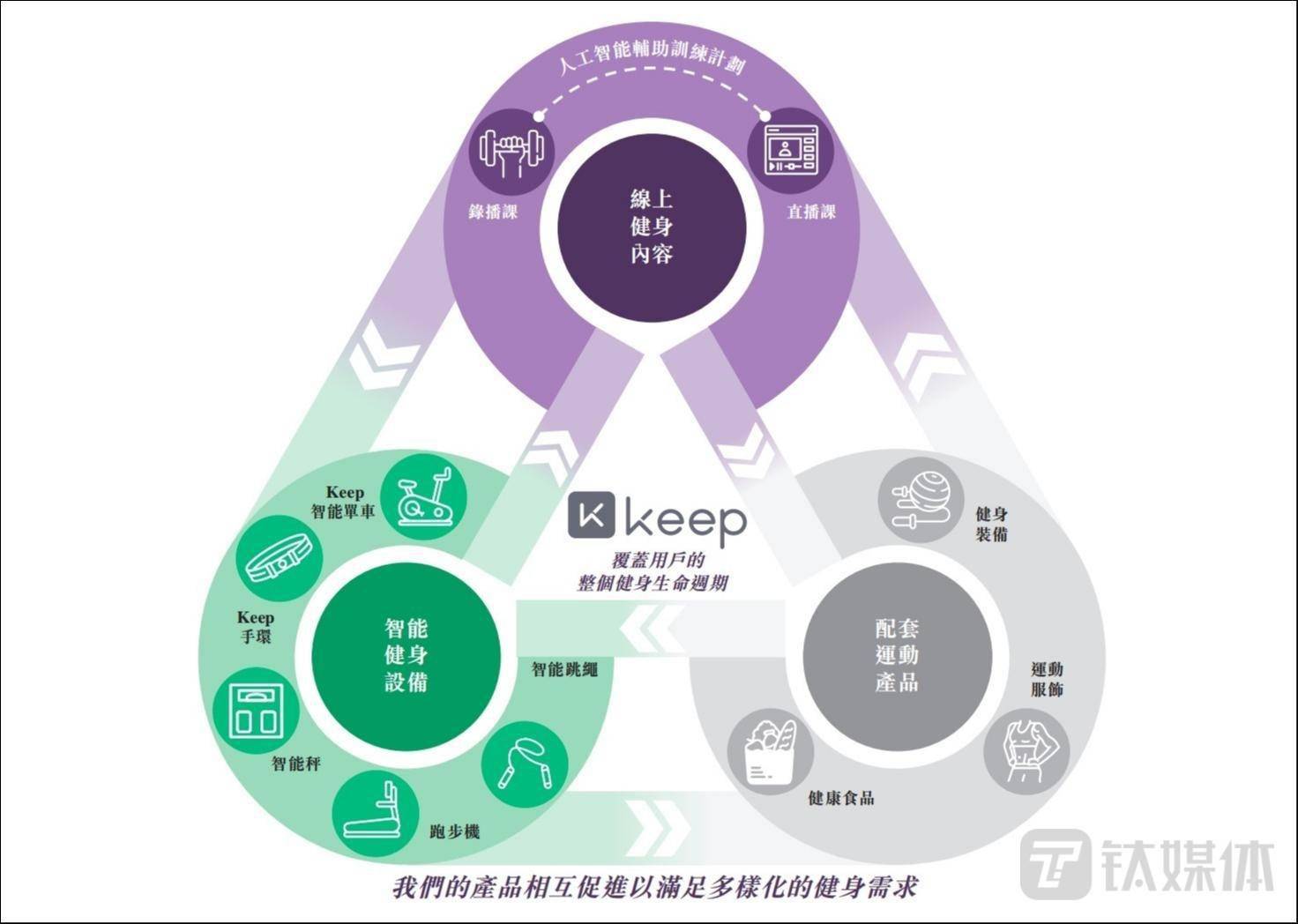 内容、硬件、服务,Keep已成为业内更为全面的健康生态玩家,单纯以工具或者是内容属性来定义Keep肯定是不妥的。这三条业务线相辅相成,形成一个协同的业务模式,也让Keep难以被定义,模板只能是自己。