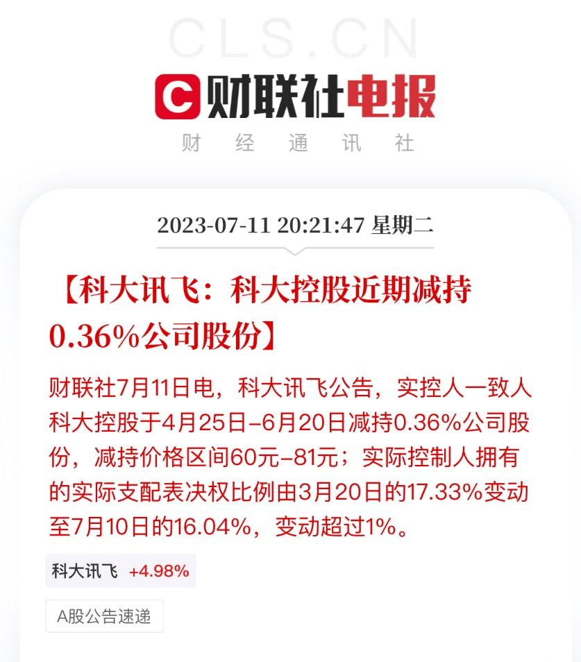 根据财联社的信息,科大讯飞在完成了减持之后,公告了。