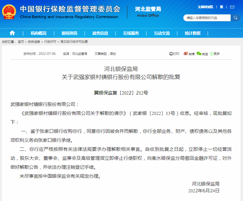 根据河北银保监局《关于武强家银村镇银行股份有限公司解散的批复》, 鉴于张家口银行收购武强家银村镇银行,同意该村镇银行因被合并而解散,该村镇银行全部业务、财产、债权债务以及其他各项权利义务由张家口银行承继。