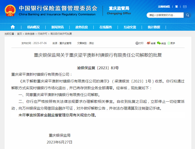 《关于解散重庆梁平澳新村镇银行有限责任公司的请示》(梁澳银发〔2023〕1号)收悉。你行拟通过解散方式实现村镇银行市场化退出,并已将存贷款业务全部清零。经审核,现批复如下: