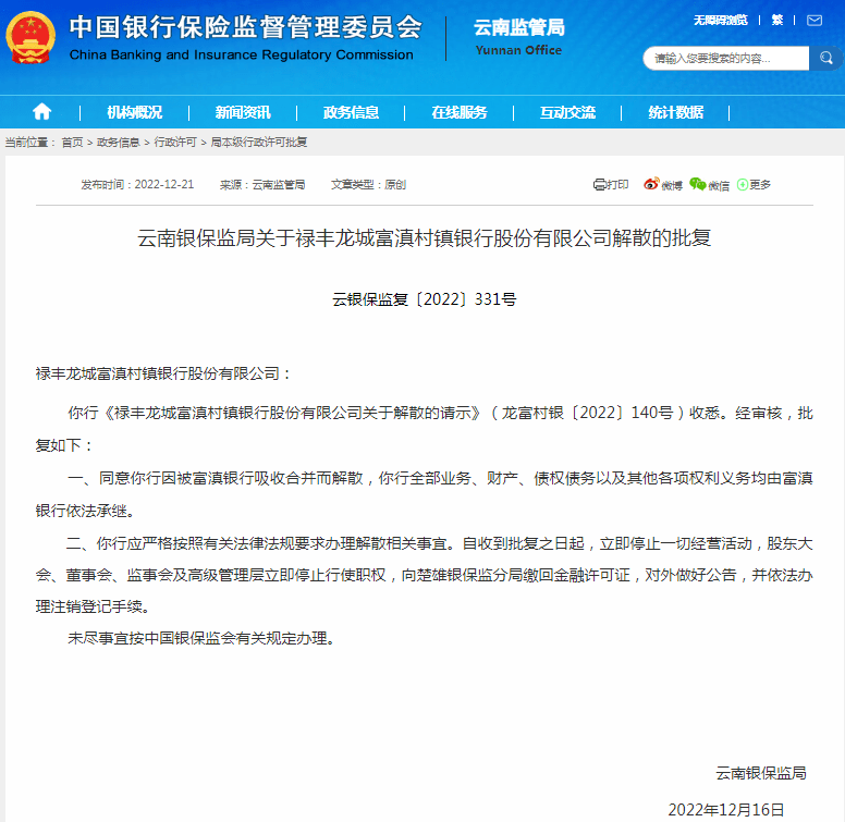 根据云南银保监局《关于禄丰龙城富滇村镇银行股份有限公司解散的批复》, 同意禄丰龙城富滇村镇银行因被富滇银行吸收合并而解散,该村镇银行全部业务、财产、债权债务以及其他各项权利义务均由富滇银行依法承继。