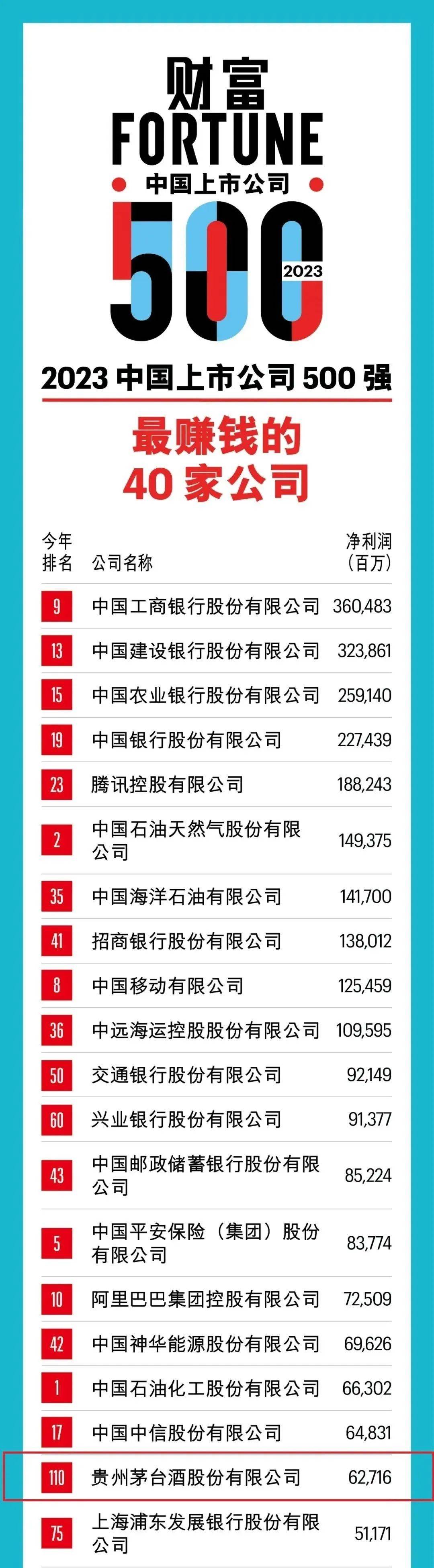 同时, 贵州茅台以627.16亿元的净利润,在最赚钱的40家公司中排名第19位。排在前面的以银行为主,还包括腾讯、中石油、中海油、中国移动、中远海运、中国平安、阿里巴巴、中国神华、中石化等。