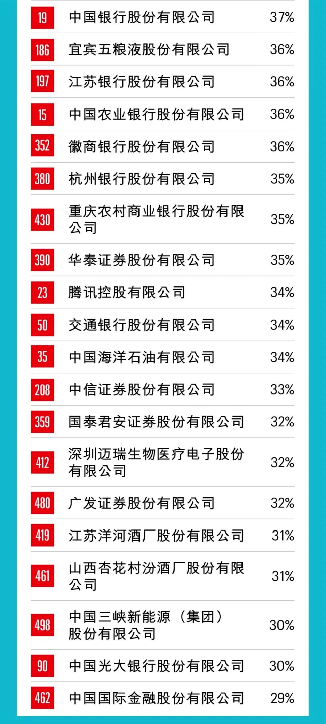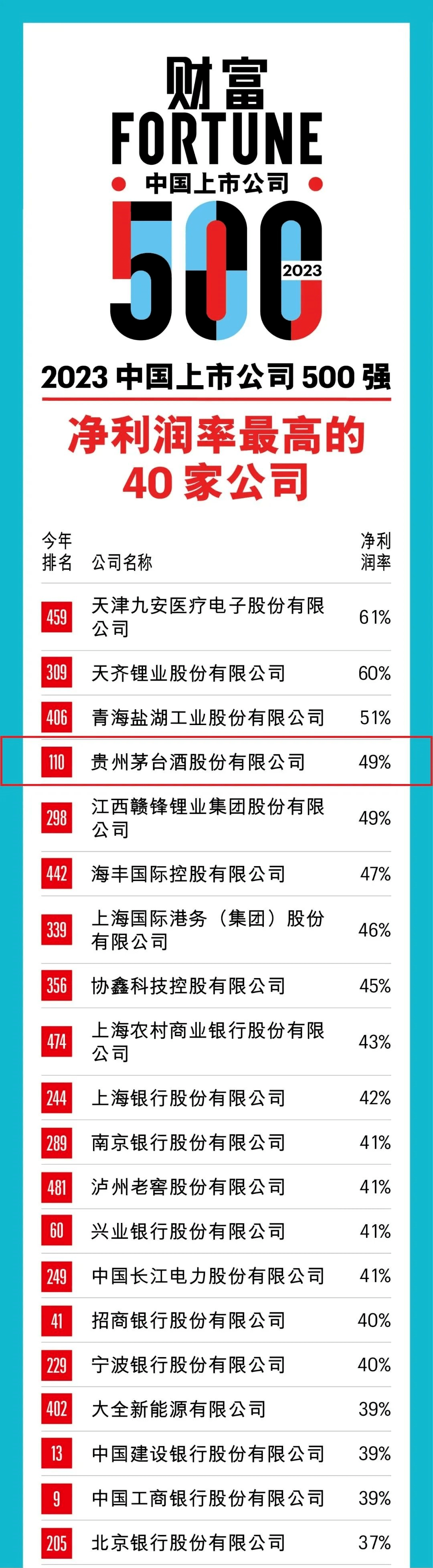 贵州茅台还以49%的净利润率排名第四,仅次于天津九安医疗电子股份有限公司、天齐锂业股份有限公司、青海盐湖工业股份有限公司。